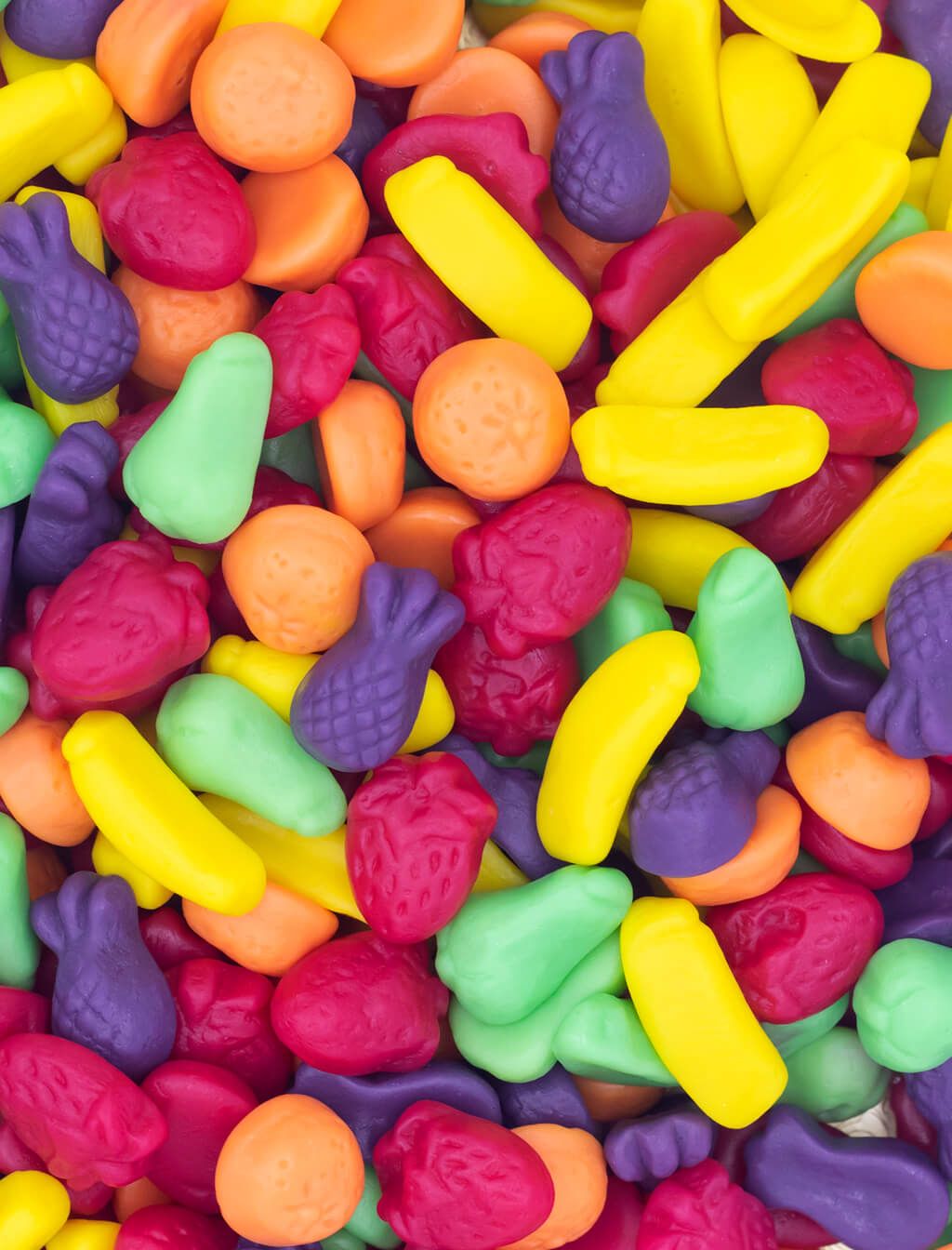 Ingredientes: jarabe de glucosa, azúcar, almidón de maíz, gelatina, acidulante: ácido cítrico; aromas, agente de recubrimiento: cera carnauba, cera de abejas; colorantes: E102, E133, E129.